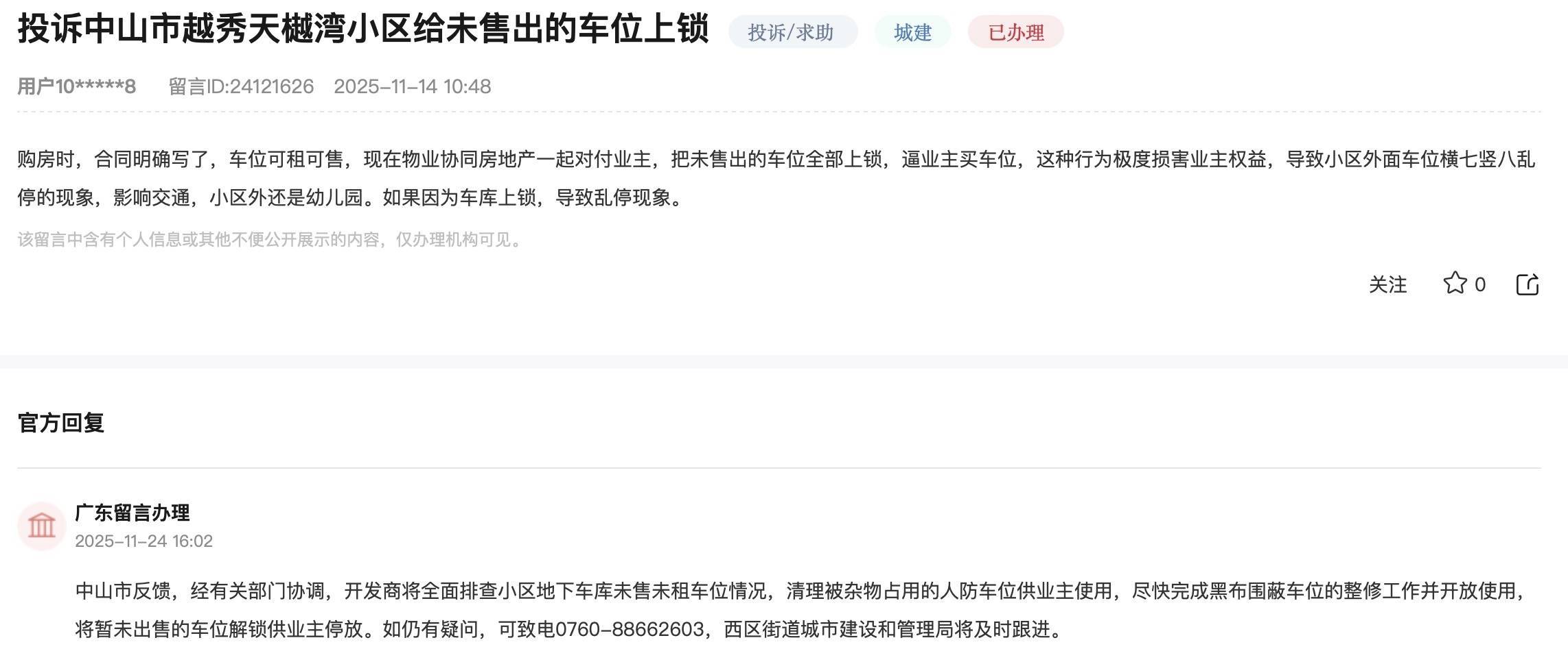 11月24日,留言办理单位回复网友称:“经中山市有关部门协调,开发商将全面排查越秀天樾湾小区地下车库未售未租车位情况,清理被杂物占用的人防车位供业主使用,尽快完成黑布围蔽车位的整修工作并开放使用,将暂未出售的车位解锁供业主停放。西区街道城市建设和管理局将及时跟进。”